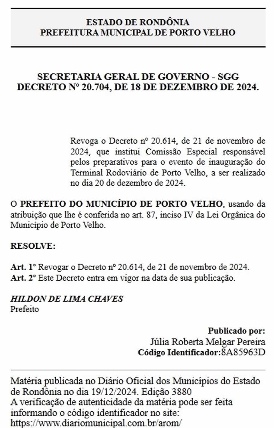 Porto Velho, RO – O prefeito de Porto Velho, Hildon Chaves (PSDB), revogou o decreto que instituía a comissão responsável pela organização do evento de inauguração da Nova Rodoviária, inicialmente programado para o dia 20 de dezembro de 2024. A decisão, formalizada por meio do Decreto nº 20.704, publicado no Diário Oficial dos Municípios do Estado de Rondônia no dia 19 de dezembro, foi tomada com base em análises técnicas da Secretaria Municipal de Obras (Semob) e em cumprimento a uma deliberação do Tribunal de Contas do Estado (TCE/RO).