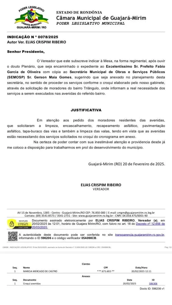 Na última sessão da Câmara Municipal de Guajará-Mirim, realizada no dia 24 de fevereiro de 2025, o vereador Elias Crispim (PP) apresentou a Indicação nº 0078/2025, solicitando à Prefeitura a realização de serviços de infraestrutura no bairro Triângulo. A proposta, encaminhada ao prefeito Fábio Garcia de Oliveira e ao secretário municipal de Obras e Serviços Públicos, Gerson Maia Gomes, busca atender às demandas da comunidade local.