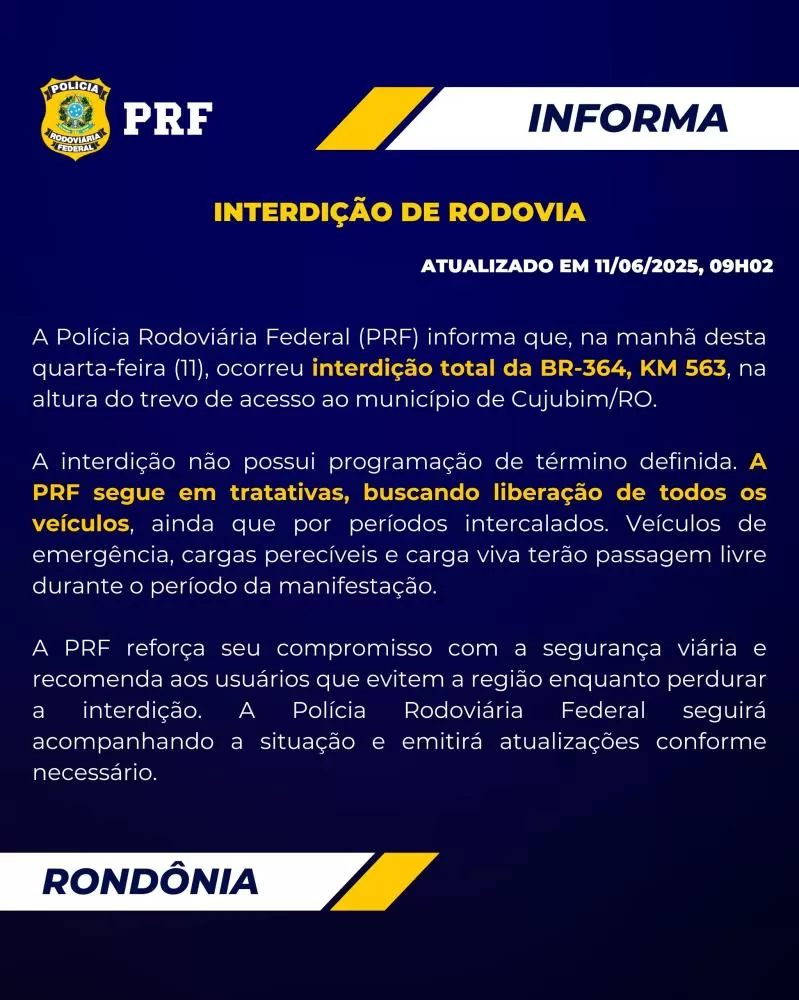 A BR-364, uma das principais rodovias de Rondônia, foi novamente interditada na manhã desta quarta-feira (11), no km 563, nas proximidades do trevo de acesso ao município de Cujubim. A mobilização começou ainda na terça-feira (10), organizada pela Associação dos Produtores Rurais e Pecuarista Soldado da Borracha.