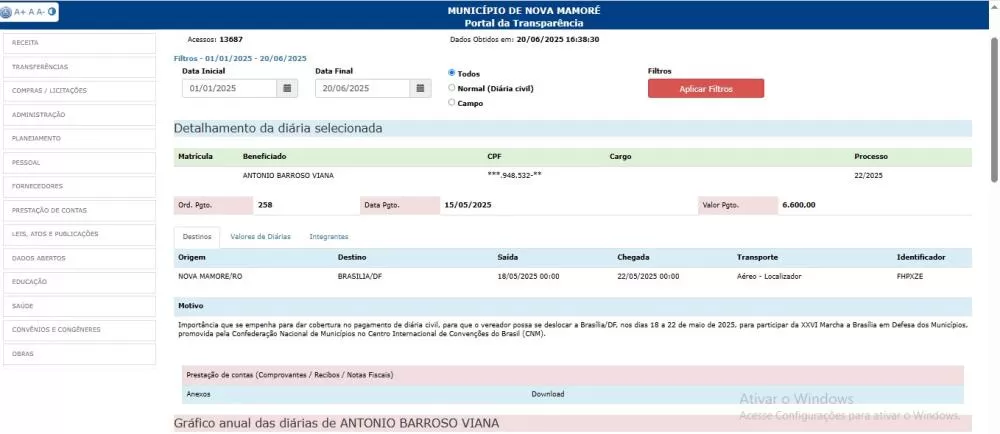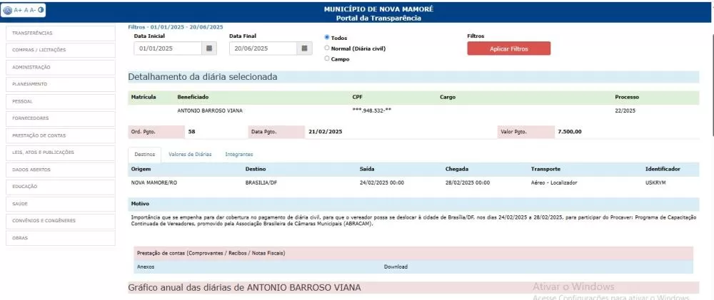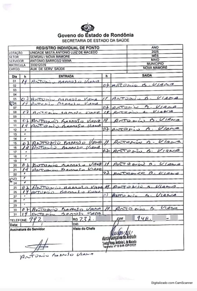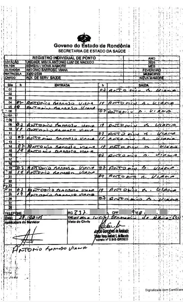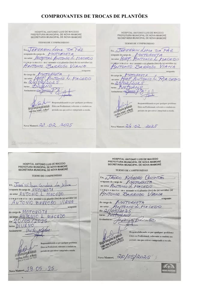De acordo com os documentos obtidos pela reportagem, a situação teria ocorrido em dois momentos distintos neste ano de 2025, envolvendo viagens institucionais do parlamentar à capital federal, ao mesmo tempo em que ele constava como presente em seu local de trabalho no Hospital Municipal Antônio Luiz de Macedo, em Nova Mamoré.