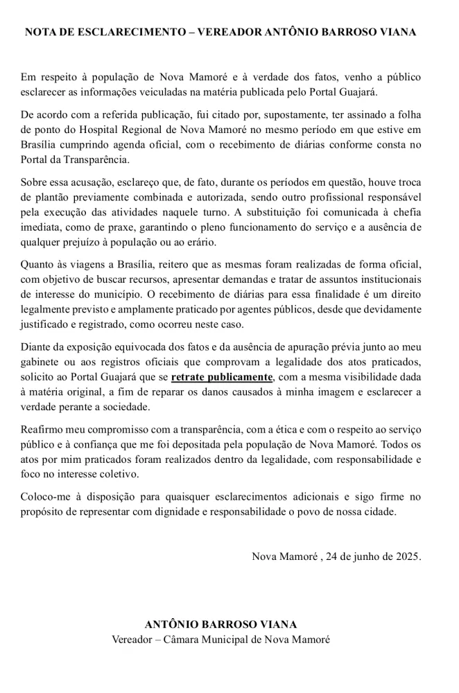 O Portal Guajará reitera que a matéria foi elaborada com base em documentos públicos que chegaram até nossa equipe por meio de denúncia anônima, incluindo a folha de ponto do vereador, na qual não constava, até o momento da apuração, qualquer observação formal quanto à substituição do plantão. A publicação utilizou o termo “é acusado”, preservando o princípio da imparcialidade e o direito à ampla defesa, agora garantido com esta atualização.