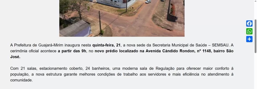A Prefeitura de Guajará-Mirim inaugurou, nesta quinta-feira (21), o novo prédio da Secretaria Municipal de Saúde (SEMSAU). Embora o contrato de locação não mencione o endereço do imóvel, ele está localizado na Avenida Cândido Rondon, nº 1148, bairro São José, e abrigará a sede administrativa da pasta responsável pelas políticas públicas de saúde no município.