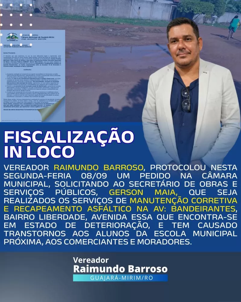 O vereador Raimundo Braga Barroso, 3º secretário da Câmara Municipal de Guajará-Mirim, protocolou a Indicação Legislativa nº 532/2025, que será apreciada na sessão ordinária desta terça-feira (09/09). A proposta solicita ao secretário municipal de Obras e Serviços Públicos (SEMOSP), Gerson Maia Gomes, a execução de serviços de manutenção corretiva e recapeamento asfáltico na Avenida Bandeirantes, no trecho entre as Avenidas 15 de Novembro e Princesa Isabel, no bairro Liberdade.