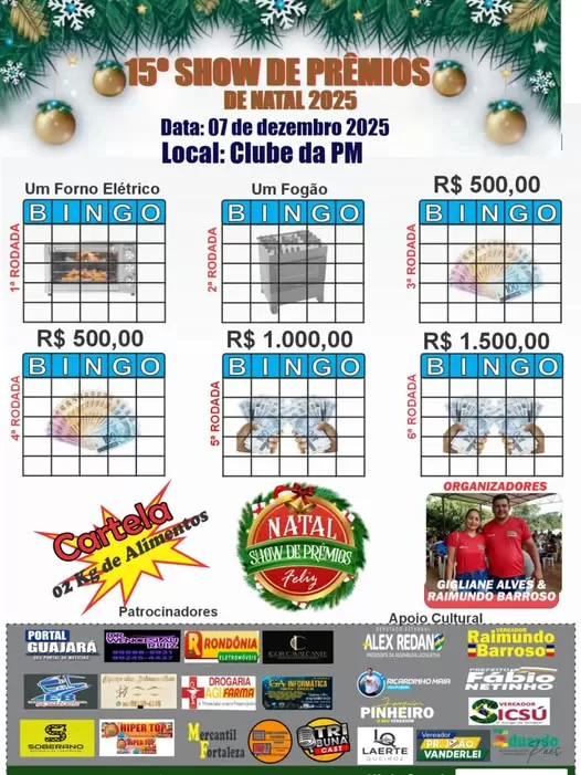 O tradicional Show de Prêmios de Natal, considerado o maior evento solidário de Guajará-Mirim (RO), já tem data marcada. A 15ª edição será realizada no dia 07 de dezembro de 2025, a partir das 9h30 da manhã, no Clube da PM, localizado no bairro Serraria.