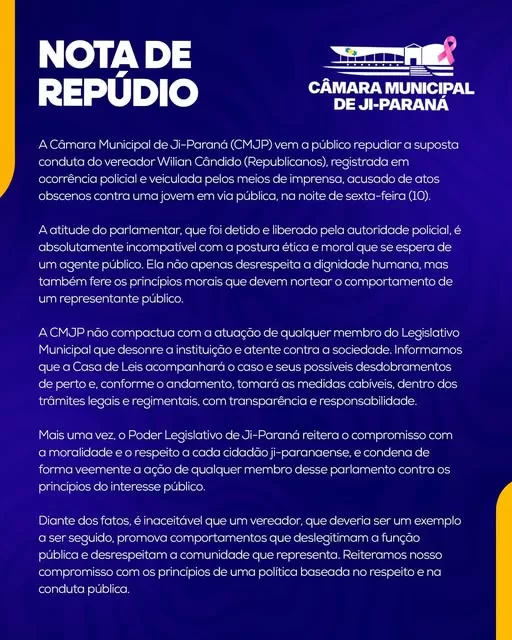 A Câmara de Vereadores de Ji-Paraná emitiu uma nota de repúdio, afirmando que o comportamento do vereador é inaceitável e incompatível com a postura que se espera de um agente público.