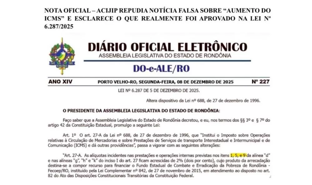 A Federação das Associações Comerciais e Empresariais de Rondônia (Facer) também divulgou nota de esclarecimento para afastar afirmações de fake News divulgadas em alguns sites e grupos de mensagens na terça-feira (9), atribuindo à Lei 6.287/2025 um suposto aumento do ICMS sobre produtos essenciais e eletrônicos.
