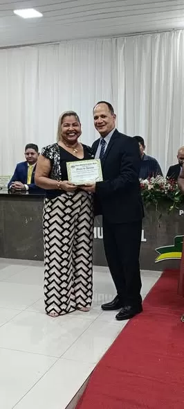 Durante a solenidade, o vereador Elias Crispim prestou homenagem por meio de Moções de Aplausos à professora Kátia Erika Rodrigues Flores, diretora do Centro Educacional Mundo Encantado, em reconhecimento aos 30 anos de dedicação à educação, marcados pela formação de gerações e pela contribuição significativa ao ensino no município.
