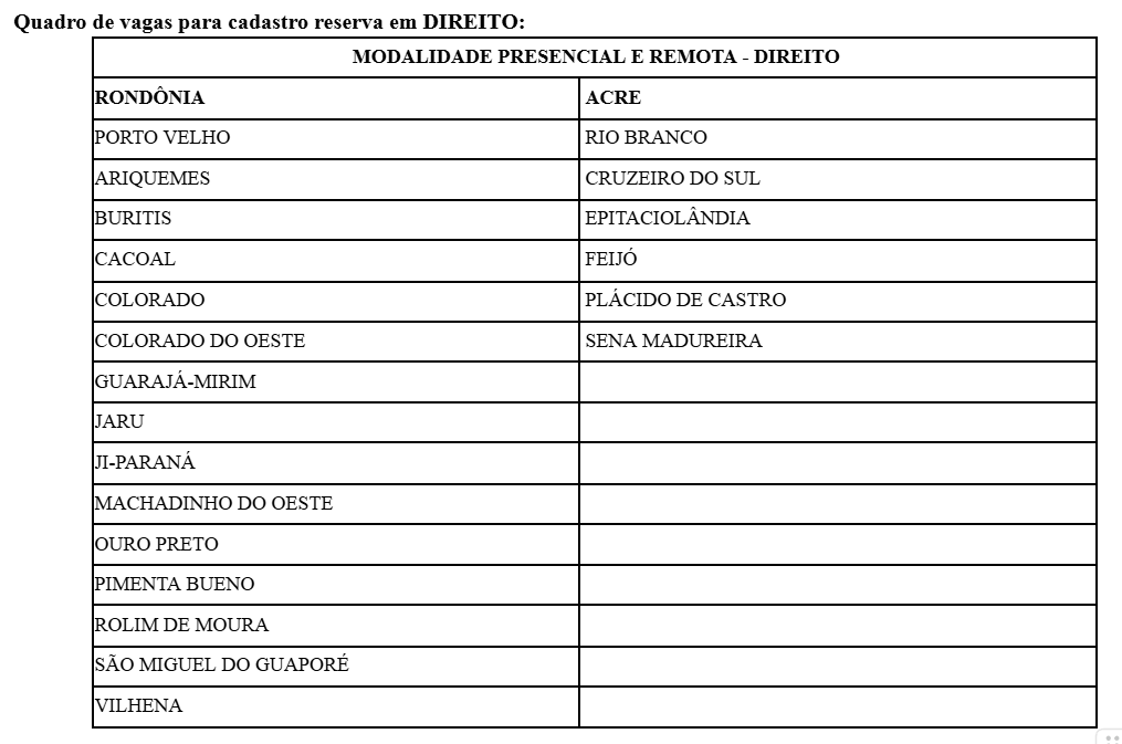 Direito: Vagas presenciais e remotas para diversas cidades de Rondônia e Acre;