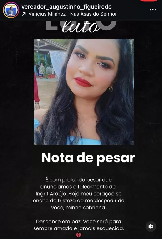 O vereador Augustinho Figueiredo manifestou profundo pesar pelo falecimento de sua sobrinha, Ingrid Araújo, jovem de Guajará-Mirim. A notícia causou grande comoção entre familiares, amigos e pessoas próximas.