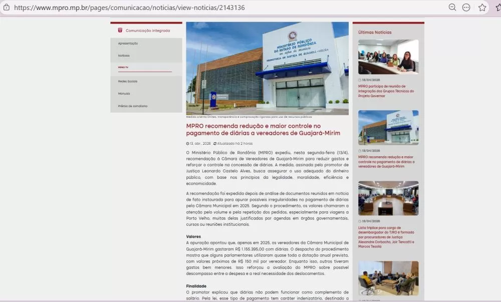 O Ministério Público de Rondônia (MPRO) expediu recomendação à Câmara Municipal de Guajará-Mirim para redução de gastos e maior controle na concessão de diárias aos vereadores. A medida, divulgada nesta segunda-feira (13), tem como objetivo assegurar o uso adequado dos recursos públicos.