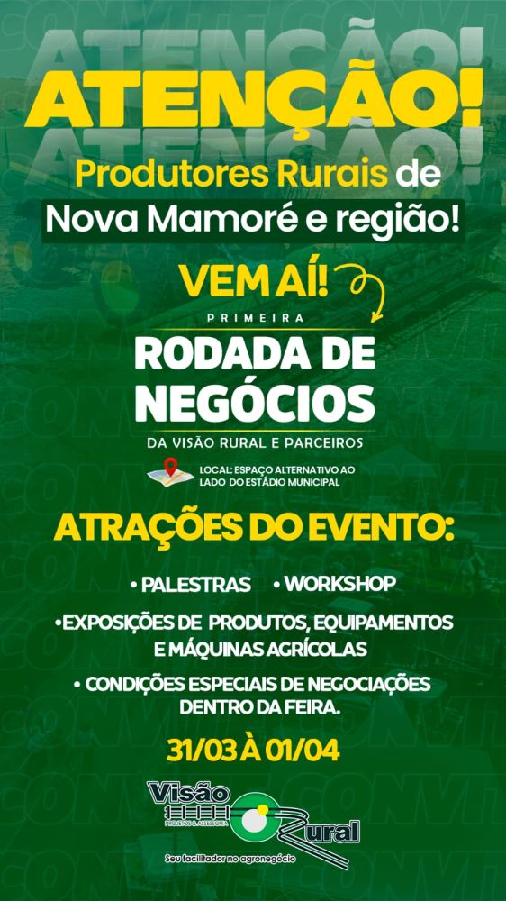Neste final de semana no município de Nova Mamoré (RO), acontece a 1ª rodada de negócios da visão rural e parceiros. O evento está programado para ser realizado entre os dias 31 e 1° de abril, no Espaço Alternativo em Nova Mamoré, ao lado do Estádio.