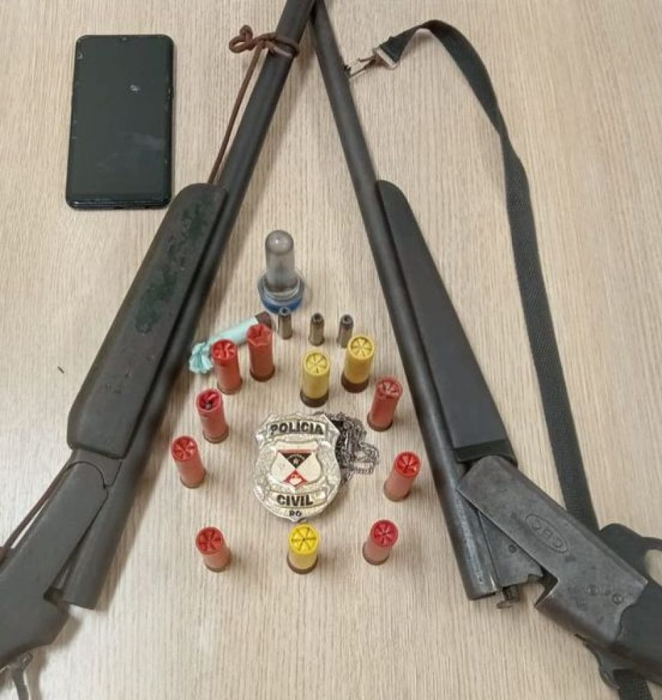 Durante as buscas os policiais civis apreenderam munições do cal. 38, duas espingardas e munições do calibre 20 e 28.