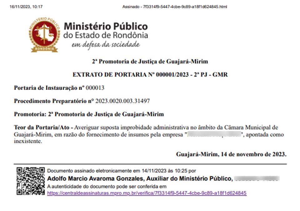 Porto Velho, RO – Foi publicada no Diário Oficial Eletrônico do Ministério Público de Rondônia (MP/RO) desta quinta-feira, 16, extrato de Portaria deflagrando investigação sobre suposto ato de improbidade administrativa.